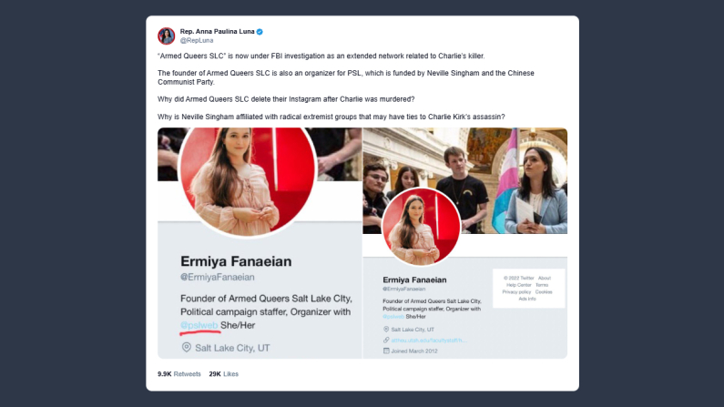 Il membro della Camera statunitense per lo Stato della Florida, Anna Paulina Luna, ha dichiarato su X che la “Armed Queers SLC” si trova ora «sotto indagine da parte dell’Fbi, indiziata come rete coinvolta all’assassino di Charlie Kirk». Il fondatore di Armed Queers SLC, afferma Luna, è anche un «organizzatore del Partito per il Socialismo e la Liberazione, finanziato da Neville Singham e dal Partito Comunista Cinese». Nel post, Luna ha poi pubblicamente chiesto perché la Armed Queers SLC ha «cancellato il proprio account Instagram dopo l’omicidio di Charlie Kirk?». E poi: «perché Neville Singham è affiliato a gruppi radicali che potrebbero avere legami con l’assassino di Charlie Kirk?».