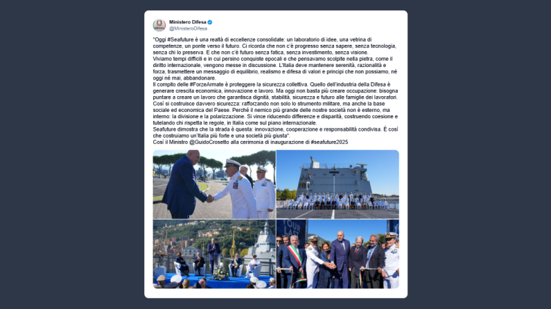 Parlando di Seafuture, mostra internazionale e business convention focalizzata sulle tecnologie, sistemi e innovazioni del settore marittimo, il ministero della Difesa ha commenta su X: «Oggi Seafuture è una realtà di eccellenze consolidate: un laboratorio di idee, una vetrina di competenze, un ponte verso il futuro. Ci ricorda che non c’è progresso senza sapere, senza tecnologia, senza chi lo preserva. E che non c’è futuro senza fatica, senza investimento, senza visione». E poi: «il compito delle Forze Armate è proteggere la sicurezza collettiva. Quello dell’industria della Difesa è generare crescita economica, innovazione e lavoro».