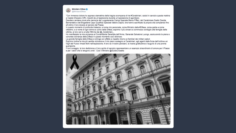 Il ministero della Difesa ha riportato su X il commento del ministro della Difesa Guido Crosetto sulla tragica morte dei tre Carabnieri caduti in servizio questa mattina a Castel d’Azzano (VR), a causa di una esplosione avvenuta durante un’operazione di sgombero. «Desidero rendere onore alla memoria del Luogotenente Carica Speciale Marco Piffari, del Carabiniere Scelto Davide Bernardello e del Brigadiere Capo Qualifica Speciale Valerio Daprà, che hanno sacrificato la propria vita compiendo fino all’ultimo il loro dovere al servizio del Paese – In questo momento di profonda tristezza […] a nome di ogni donna e uomo della Difesa, esprimo il più sincero e commosso cordoglio alle famiglie delle vittime, ai loro cari e a tutta l’Arma dei Carabinieri.