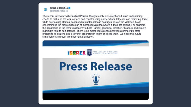 L’ambasciata di Israele presso la Santa Sede ha così criticato la recente intervista del cardinale Parolin su X: