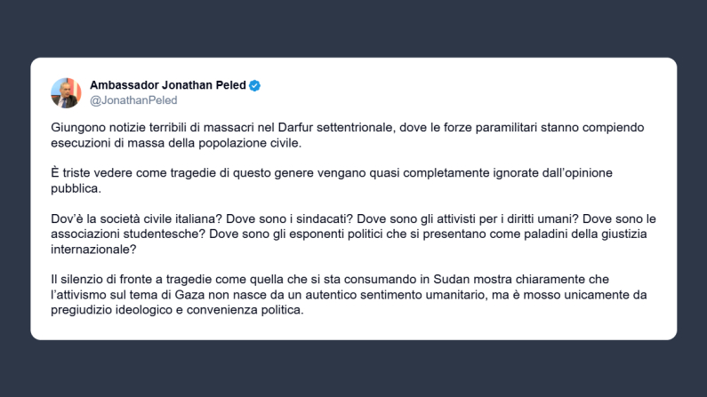 L’ambasciatore israeliano in Italia, Jonathan Peled, ha scritto su X: «giungono notizie terribili di massacri nel Darfur settentrionale, dove le forze paramilitari stanno compiendo esecuzioni di massa della popolazione civile. È triste vedere come tragedie di questo genere vengano quasi completamente ignorate dall’opinione pubblica. Dov’è la società civile italiana? Dove sono i sindacati? Dove sono gli attivisti per i diritti umani? Dove sono le associazioni studentesche? Dove sono gli esponenti politici che si presentano come paladini della giustizia internazionale? Il silenzio di fronte a tragedie come quella che si sta consumando in Sudan mostra chiaramente che l’attivismo sul tema di Gaza non nasce da un autentico sentimento umanitario, ma è mosso unicamente da pregiudizio ideologico e convenienza politica».