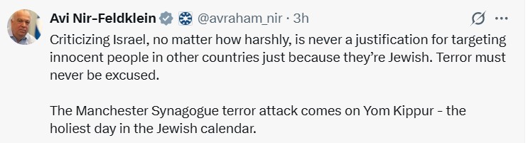 L’ambasciatore di Israele presso l’Unione europea, Avi Nir-Feldklein, ha scritto su X: «Criticare Israele, per quanto duramente, non giustifica mai il prendere di mira persone innocenti in altri Paesi solo perché ebrei. Il terrorismo non deve mai essere scusato. L’attacco terroristico alla sinagoga di Manchester è avvenuto durante lo Yom Kippur, il giorno più sacro del calendario ebraico».