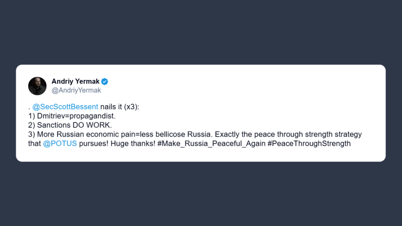Il capo dell’ufficio del presidente dell’Ucraina, Andriy Yermak, ha scritto ieri su X: «Scott Bessent centra il punto (per tre volte): Kirill Dmitriev è un propagandista, e le sanzioni stanno funzionando. Causare sofferenza economica a Mosca significa avere una Russia meno bellicosa, che è esattamente la strategia di pace attraverso la forza perseguita dal presidente degli Stati Uniti».