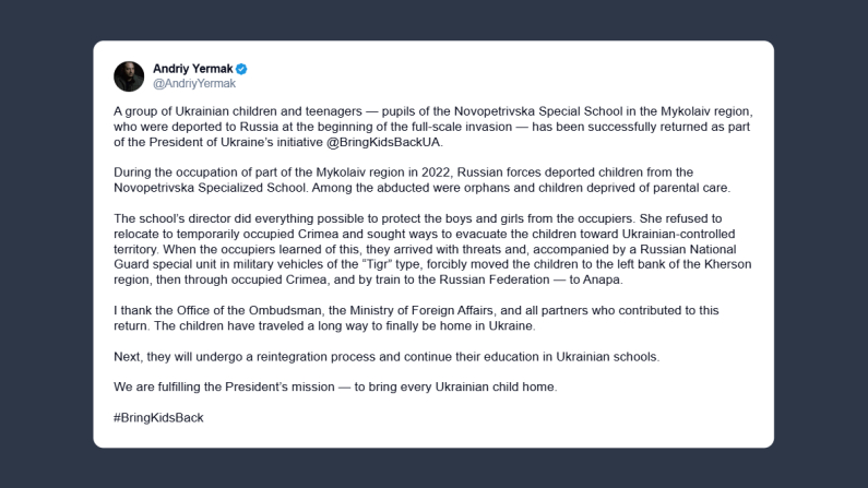 Il capo dell’ufficio del presidente dell’Ucraina, Andriy Yermak, ha scritto ieri su X: «un gruppo di bambini e adolescenti ucraini, alunni della scuola speciale di Novopetrivska, nella regione di Mykolaiv, deportati in Russia all’inizio dell’invasione su vasta scala, è stato riportato in patria con successo nell’ambito dell’iniziativa presidenziale Bringids Back Ua. Durante l’occupazione di una parte della regione di Mykolaiv nel 2022, le forze russe deportarono i minori dalla scuola. Tra i rapiti vi erano orfani e bambini privi di cure parentali. La direttrice della scuola fece tutto il possibile per proteggere i ragazzi dagli occupanti. Rifiutò di trasferirsi in Crimea, temporaneamente occupata, e cercò di evacuare i bambini verso territori sotto controllo ucraino. Quando gli occupanti lo scoprirono, giunsero scortati da un’unità speciale della guardia Nazionale russa a bordo di veicoli militari tipo Tigr, trasferirono con la forza i minori sulla riva sinistra della regione di Kherson, poi attraverso la Crimea occupata e in treno verso la Federazione russa, ad Anapa. Ringrazio l’ufficio del mediatore, il ministero degli Esteri e tutti i partner che hanno contribuito al rientro. I bambini hanno percorso una lunga strada per essere finalmente a casa in Ucraina. Ora seguiranno un percorso di reintegrazione e riprenderanno gli studi nelle scuole ucraine. Stiamo realizzando la missione del presidente, riportare a casa ogni bambino ucraino».