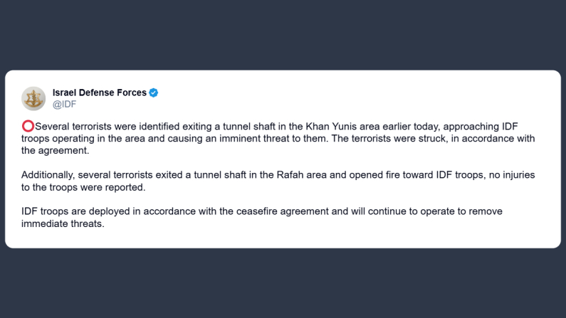 Le Forze armate israeliane hanno scritto ieri su X: «diverse unità terroristiche sono state avvistate oggi mentre uscivano da un tunnel nell’area di Khan Yunis, avvicinandosi alle truppe delle Forze di difesa israeliane operanti nella zona e rappresentando un’imminente minaccia. I terroristi sono stati colpiti, in linea con gli accordi vigenti».