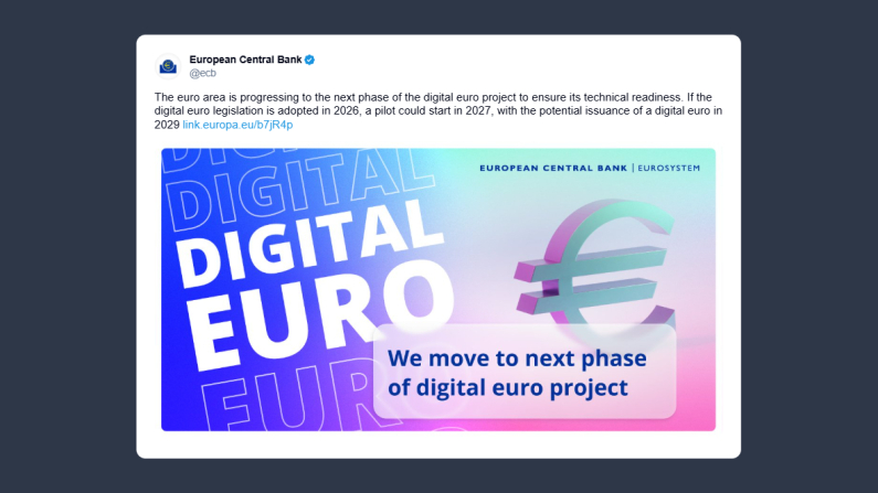 La Banca centrale europea ha scritto su X: «l’area euro avanza alla fase successiva del progetto per l’euro digitale, allo scopo di garantirne la preparazione tecnica. Qualora la normativa sull’euro digitale venga adottata nel 2026, una fase pilota potrebbe avviarsi nel 2027, con l’emissione effettiva di un euro digitale nel 2029».