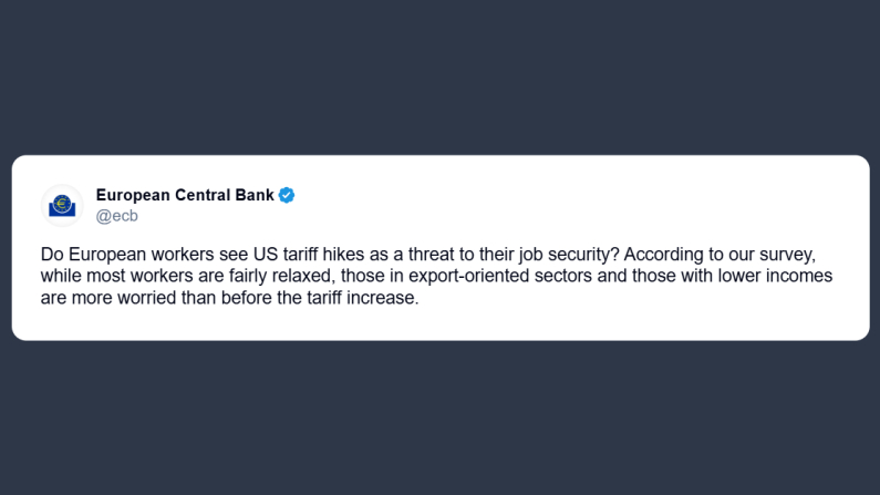 La Banca Centrale europea ha scritto su X: «I lavoratori europei percepiscono gli aumenti dei dazi negli Stati Uniti come una minaccia per la loro sicurezza lavorativa?» Secondo il sondaggio della Bce, mentre la maggior parte dei lavoratori appare «piuttosto tranquilla», gli impiegati in settori orientati all’export e con redditi più bassi manifestano una «preoccupazione maggiore rispetto al periodo precedente l’aumento dei dazi».