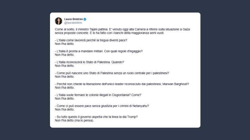 Il deputato del Partito Democratico, Laura Boldrini, nell’ambito di una serie di domande, ha chiesto su X al ministro degli Esteri Tajani: «Perché non chiede la liberazione dell’unico leader riconosciuto dai palestinesi, Marwan Barghouti?».