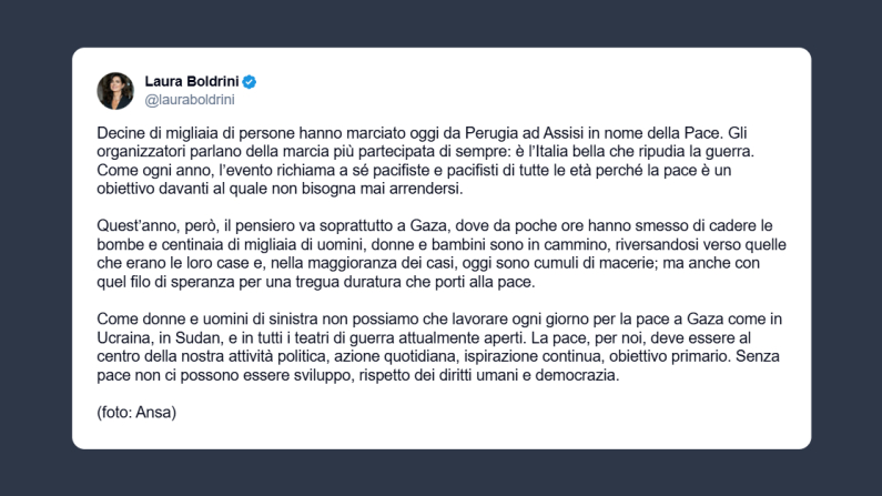 Il deputato del Partito Democratico, Laura Boldrini, ha dichiarato su X: «Decine di migliaia di persone hanno marciato da Perugia ad Assisi in nome della Pace. Gli organizzatori parlano della marcia più partecipata di sempre: è l’Italia bella che ripudia la guerra. Come ogni anno, l’evento richiama a sé pacifiste e pacifisti di tutte le età perché la pace è un obiettivo davanti al quale non bisogna mai arrendersi».
