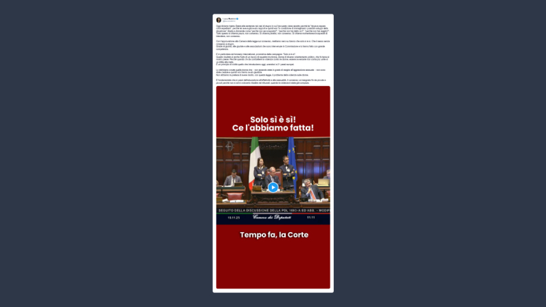 Il deputato del Partito Democratico, Laura Boldrini, ha scritto su X: «oggi diciamo basta. Basta alle sentenze nei casi di stupro in cui l’accusato viene assolto perché lei “doveva sapere cosa aspettarsi”, perché lei aveva già avuto rapporti e quindi era “in condizione di immaginarsi i possibili sviluppi della situazione”. Basta a domande come “perché non sei scappata?”, “perché non hai detto no?”, “perché non hai reagito?”. Tutto questo si chiama paura, non consenso. Si chiama paralisi, non consenso. Si chiama momentanea incapacità di intendere, non consenso. Con l’approvazione alla Camera della legge sul consenso, mettiamo nero su bianco che solo sì è sì. Che il sesso senza consenso è stupro. Grazie ai giuristi, alle giuriste e alle associazioni che sono intervenute in commissione e lo hanno fatto con grande competenza. E in particolare ad Amnesty International, promotrice della campagna: “Solo sì è sì”.