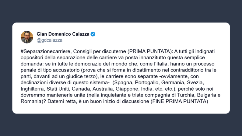 L’avvocato Gian Domenico Caiazza, ex presidente Unione Camere Penali, ha scritto su X il 23/7: «Separazione carriere, Consigli per discuterne: A tutti gli indignati oppositori della separazione delle carriere va posta innanzitutto questa semplice domanda: se in tutte le democrazie del mondo che, come l’Italia, hanno un processo penale di tipo accusatorio (prova che si forma in dibattimento nel contraddittorio tra le parti, davanti ad un giudice terzo), le carriere sono separate -ovviamente, con declinazioni diverse di questo sistema- (Spagna, Portogallo, Germania, Svezia, Inghilterra, Stati Uniti, Canada, Australia, Giappone, India, etc. etc.), perché solo noi dovremmo mantenerle unite (nella inquietante e triste compagnia di Turchia, Bulgaria e Romania)? Datemi retta, è un buon inizio di discussione».