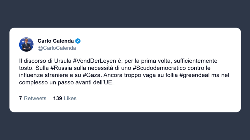 «Il discorso di Ursula von der Leyen è, per la prima volta, sufficientemente tosto sulla Russia, sulla necessità di uno “Scudo democratico” contro le influenze straniere e su Gaza». Lo ha scritto il presidente di Azione, Carlo Calenda, in un post su X. Ma la von der Leyen è ancora troppo vaga sulla follia del Green Deal, anche se – dice Calenda – nel complesso l’Ue sta facendo un passo avanti.