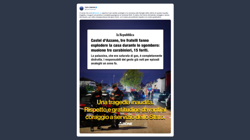 Il segretario di Azione, Carlo Calenda, ha commentato su X la tragica morte dei tre Carabnieri caduti in servizio questa mattina a Castel d’Azzano (VR), a causa di una esplosione avvenuta durante un’operazione di sgombero. «A nome mio e di Azione, esprimo il più sentito cordoglio e la vicinanza alle famiglie delle vittime di questa inaudita tragedia, e auguro una pronta e completa guarigione ai numerosi feriti. A coloro che hanno dimostrato coraggio e senso del dovere, pur nella consapevolezza dei gravi rischi, va il nostro più profondo rispetto e la nostra gratitudine».