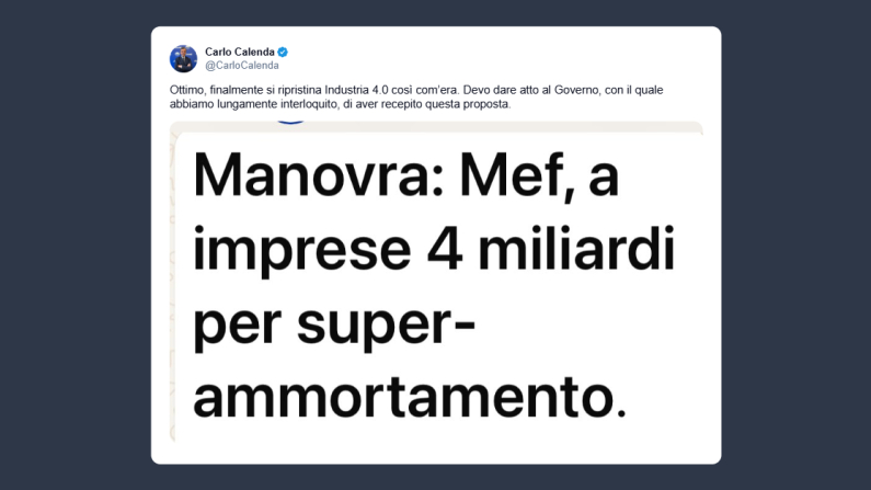 Il segretario di Azione, Carlo Calenda, ha commentato su X il ripristino «dell’Industria 4.0 così com’era. Ottimo, devo dare atto al Governo, con il quale abbiamo lungamente interloquito, di aver recepito questa proposta».