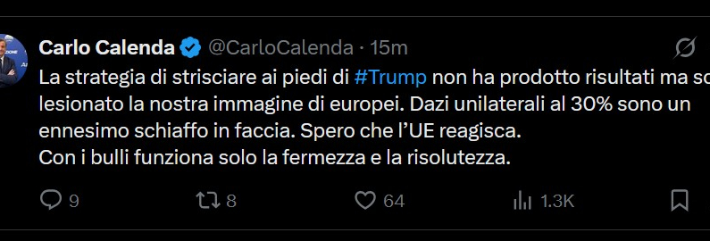 Il leader di Azione, Carlo Calenda, ha scritto un post su X che la «Strategia di strisciare ai piedi di Trump non ha prodotto risultati ma solo lesionato la nostra immagine di europei», ha scritto. «Dazi unilaterali al 30% sono un ennesimo schiaffo in faccia. Spero che l’Ue reagisca». Calenda ha poi aggiunto: «Con i bulli funziona solo la fermezza e la risolutezza», esortando l’Unione Europea a rispondere con decisione alle politiche commerciali protezionistiche di Trump per difendere gli interessi europei.