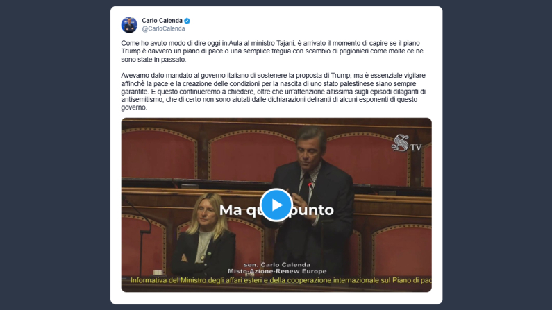 Il segretario di Azione, Carlo Calenda, ha scritto su X: «come ho avuto modo di dire oggi in aula al ministro Tajani, è arrivato il momento di capire se il piano Trump è davvero un piano di pace o una semplice tregua con scambio di prigionieri come molte ce ne sono state in passato». «Avevamo dato mandato al Governo italiano di sostenere la proposta di Trump – conclude Calenda -, ma è essenziale vigilare affinché la pace e la creazione delle condizioni per la nascita di uno stato palestinese siano sempre garantite. E questo continueremo a chiedere, oltre che un’attenzione altissima sugli episodi dilaganti di antisemitismo, che di certo non sono aiutati dalle dichiarazioni deliranti di alcuni esponenti di questo Governo».