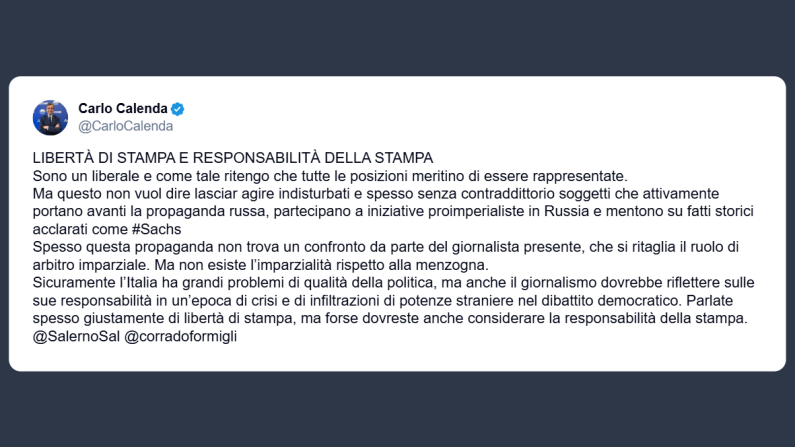 Il segretario di Azione, Carlo Calenda, ha scritto su X: «libertà di stampa e responsabilità della stampa. Sono un liberale e come tale ritengo che tutte le posizioni meritino di essere rappresentate. Ma questo non vuol dire lasciar agire indisturbati e spesso senza contraddittorio soggetti che attivamente portano avanti la propaganda russa, partecipano a iniziative pro imperialiste in Russia e mentono su fatti storici acclarati come Sachs. Spesso questa propaganda non trova un confronto da parte del giornalista presente, che si ritaglia il ruolo di arbitro imparziale. Ma non esiste l’imparzialità rispetto alla menzogna. Sicuramente l’Italia ha grandi problemi di qualità della politica, ma anche il giornalismo dovrebbe riflettere sulle sue responsabilità in un’epoca di crisi e di infiltrazioni di potenze straniere nel dibattito democratico. Parlate spesso giustamente di libertà di stampa, ma forse dovreste anche considerare la responsabilità della stampa».