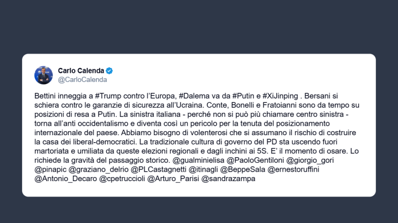 Il presidente di Azione, Carlo Calenda, ha commentato su X l’attuale clima politico italiano in relazione alle attuali (sempre più tese) tensioni geopolitiche. «Bettini inneggia a Trump contro l’Europa, Dalema va da Putin e Xi Jinping. Bersani si schiera contro le garanzie di sicurezza all’Ucraina. Conte, Bonelli e Fratoianni sono da tempo su posizioni di resa a Putin».