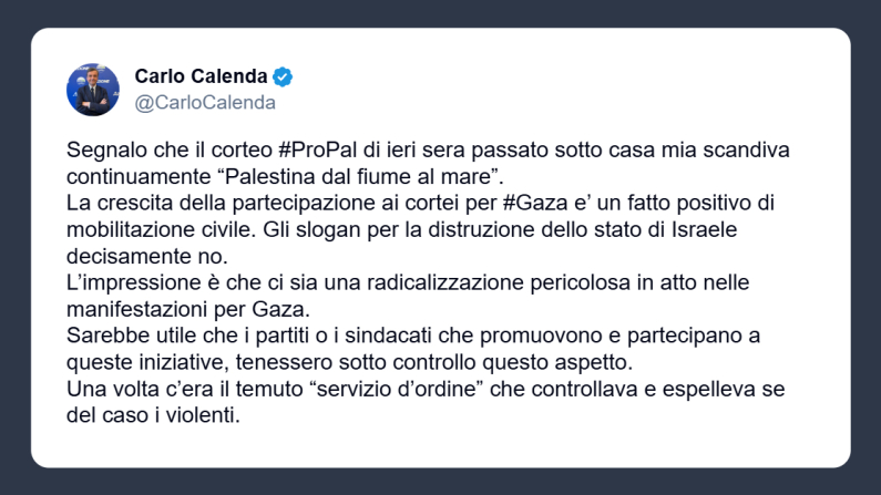 Il segretario di Azione, Carlo Calenda, ha scritto su X: «segnalo che il corteo Pro Pal di ieri sera passato sotto casa mia scandiva continuamente “Palestina dal fiume al mare”». Calenda ha proseguito evidenziando che la crescita della partecipazione ai cortei per Gaza è un «fatto positivo» di mobilitazione civile, mentre gli «slogan per la distruzione dello Stato di Israele decisamente no». L’impressione – conclude il segretario di Azione – è che ci sia una «radicalizzazione pericolosa in atto nelle manifestazioni per Gaza e sarebbe utile che i partiti e i sindacati che promuovono e partecipano a queste iniziative tenessero sotto controllo questo aspetto».