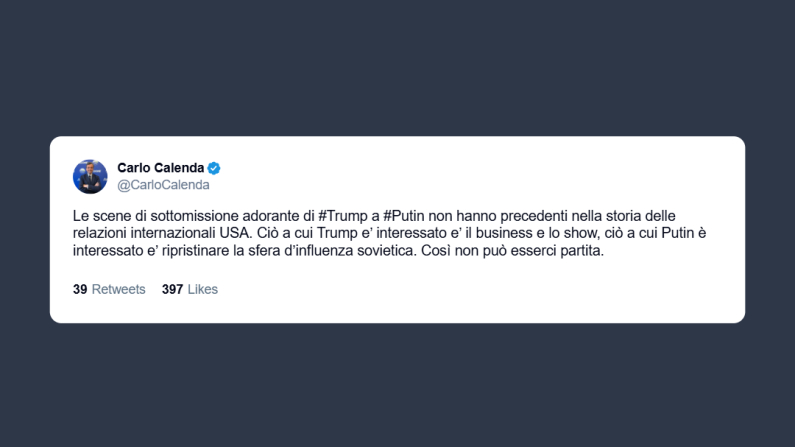 «Le scene di sottomissione adorante di Trump a Putin non hanno precedenti nella storia delle relazioni internazionali Usa». Per Calenda, Trump sarebbe interessato al «business e lo show», mentre Putin vuole «ripristinare la sfera d’influenza sovietica» e di conseguenza, secondo il presidente di Azione, «così non può esserci partita».