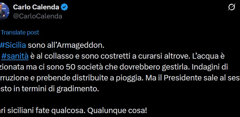Il leader di Azione, Carlo Calenda, ha lanciato un duro monito sulla situazione siciliana in un post su X. «In Sicilia sono all’Armageddon. La sanità è al collasso e sono costretti a curarsi altrove. L’acqua è razionata ma ci sono 50 società che dovrebbero gestirla. Indagini di corruzione e prebende distribuite a pioggia». Calenda ha poi espresso stupore per il gradimento del presidente della Regione: «Ma il Presidente sale al sesto posto in termini di gradimento». Ha poi concluso rivolgendosi direttamente ai cittadini: «Cari siciliani fate qualcosa. Qualunque cosa».