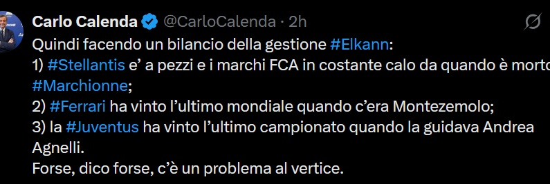 Il leader di Azione, Carlo Calenda, colpisce duro John Elkann, nipote del defunto Avvocato Agnelli e presidente di Stellantis, in un post su X che non lascia spazio a interpretazioni: «Facendo un bilancio della gestione Elkann – scrive Calenda – Stellantis è a pezzi e i marchi Fca in costante calo da quando è morto Marchionne; Ferrari ha vinto l’ultimo mondiale quando c’era Montezemolo; la Juventus ha vinto l’ultimo campionato quando la guidava Andrea Agnelli. Forse, dico forse, c’è un problema al vertice».