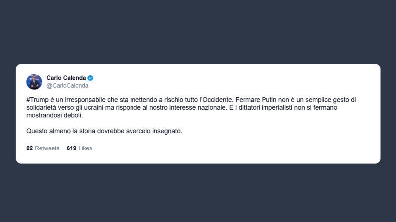 Il presidente di Azione, Carlo Calenda, ha commentato in un post su X l’operato del presidente degli Stati Uniti Donald Trump in merito alla mediazione tra Mosca e Kiev: «Trump è un irresponsabile che sta mettendo a rischio tutto l’Occidente». Fermare Putin, dice Calenda, non è un semplice «gesto di solidarietà verso gli ucraini ma risponde al nostro interesse nazionale». I dittatori imperialisti «non si fermano mostrandosi deboli», ha concluso.