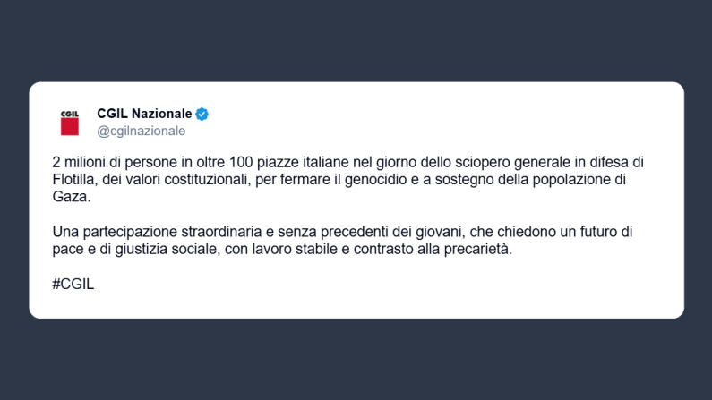 Commentando lo sciopero “pro-Pal” di ieri, la Cgil ha scritto su X: «2 milioni di persone in oltre 100 piazze italiane nel giorno dello sciopero generale in difesa di Flotilla, dei valori costituzionali, per fermare il genocidio e a sostegno della popolazione di Gaza. Una partecipazione straordinaria e senza precedenti dei giovani, che chiedono un futuro di pace e di giustizia sociale, con lavoro stabile e contrasto alla precarietà».
