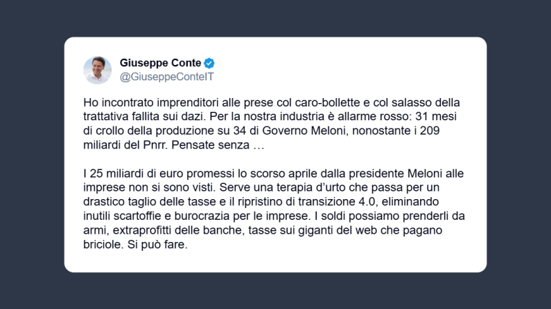 Il capo del Movimento 5 Stelle, Giuseppe Conte, ha scritto ieri su X: «Ho incontrato imprenditori alle prese col caro-bollette e col salasso della trattativa fallita sui dazi. Per la nostra industria è allarme rosso: 31 mesi di crollo della produzione su 34 di Governo Meloni, nonostante i 209 miliardi del Pnrr […] serve una terapia d’urto – prosegue Conte – che passa per un drastico taglio delle tasse e il ripristino di transizione 4.0, eliminando inutili scartoffie e burocrazia per le imprese». I soldi, conclude, si possono prendere da «armi, extraprofitti delle banche, tasse sui giganti del web che pagano briciole».