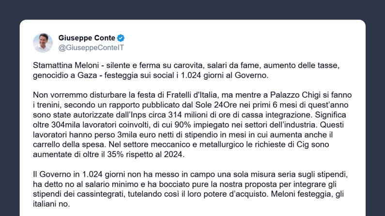Il leader del Movimento 5 Stelle Giuseppe Conte ha commentato su X la celebrazione dei 1.024 giorni del Governo Meloni anche se nel frattempo, dice Conte, la Meloni «tace su carovita, salari da fame, aumento delle tasse, genocidio a Gaza».