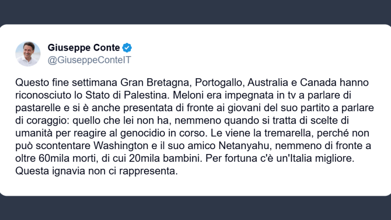 «Questo fine settimana Gran Bretagna, Portogallo, Australia e Canada hanno riconosciuto lo Stato di Palestina. Meloni era impegnata in tv a parlare di pastarelle e si è anche presentata di fronte ai giovani del suo partito a parlare di coraggio: quello che lei non ha». Lo ha dichiarato su X il presidente del Movimento 5 Stelle, Giuseppe Conte. «Le viene la tremarella — ha proseguito Conte — perché non può scontentare Washington e il suo amico Netanyahu, nemmeno di fronte a oltre 60 mila morti, di cui 20 mila bambini».