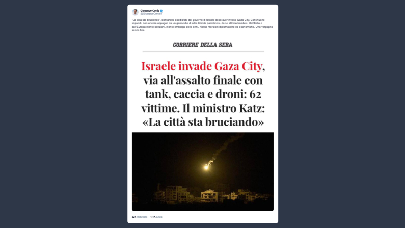 «La città sta bruciando, dichiarano soddisfatti dal governo di Israele dopo aver invaso Gaza City. Continuano impuniti, non ancora appagati da un genocidio di oltre 60mila palestinesi, di cui 20 mila bambini». Lo ha dichiarato il presidente del Movimento 5 Stelle, Giuseppe Conte, in un post su X in cui ha condiviso un articolo del Corriere della Sera. Dall’Italia e dall’Europa, dice Conte, «niente sanzioni, niente embargo delle armi, niente ritorsioni diplomatiche ed economiche. Una vergogna senza fine».