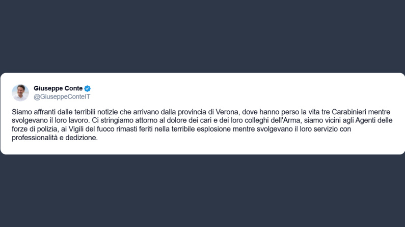 Il capo del Movimento 5 Stelle, Giuseppe Conte, ha scritto su X: «siamo affranti dalle terribili notizie che arrivano dalla provincia di Verona, dove hanno perso la vita tre Carabinieri mentre svolgevano il loro lavoro». «Ci stringiamo attorno al dolore dei cari – conclude Conte – e dei loro colleghi dell’Arma, siamo vicini agli Agenti delle forze di polizia, ai Vigili del fuoco rimasti feriti nella terribile esplosione mentre svolgevano il loro servizio con professionalità e dedizione».