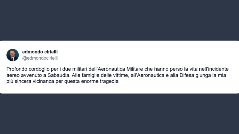 Il vice ministro degli Esteri, Edmondo Cirielli, ha espresso su X un «profondo cordoglio» per i due militari dell’Aeronautica Militare che hanno perso la vita nell’incidente aereo avvenuto a Sabaudia. «Alle famiglie delle vittime, all’Aeronautica e alla Difesa giunga la mia più sincera vicinanza per questa enorme tragedia», ha dichiarato Cirielli.