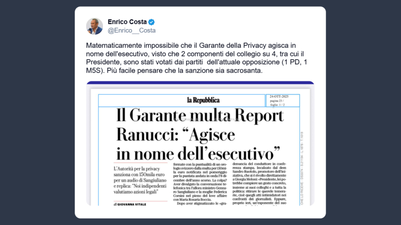Il deputato di Forza Italia, Enrico Costa, ha scritto su X: «matematicamente impossibile che il garante della privacy agisca in nome dell’esecutivo, visto che 2 componenti del collegio su 4, tra cui il presidente, sono stati votati dai partiti dell’attuale opposizione (PD, M5S). Più facile pensare che la sanzione sia sacrosanta».