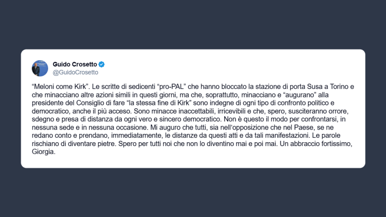 Il ministro della Difesa, Guido Crosetto, ha dichiarato su X che le scritte dei «sedicenti pro-Pal» che hanno bloccato la stazione di porta Susa a Torino e che «minacciano e augurano al presidente del Consiglio di fare la stessa fine di Kirk, sono indegne di ogni tipo di confronto politico e democratico». Per Crosetto si tratta di «minacce inaccettabili» e si augura che «tutti, sia nell’opposizione che nel Paese, se ne redano conto e prendano le distanze da questi atti e da tali manifestazioni», perché – conclude il ministro – le parole «rischiano di diventare pietre».