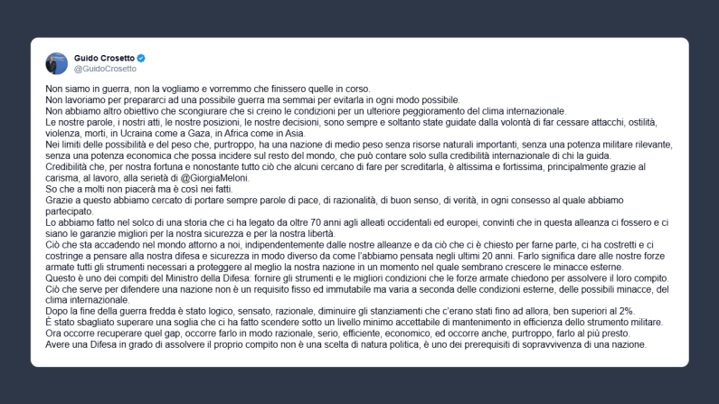 Crosetto ha evidenziato che ciò che serve per difendere una nazione non è un «requisito fisso» ma varia a seconda delle «condizioni esterne, delle possibili minacce e del clima internazionale». Dopo la fine della guerra fredda è stato «logico, sensato, razionale, diminuire gli stanziamenti, ben superiori al 2%». È stato un errore, dice il ministro, superare la «soglia che ci ha fatto scendere sotto un livello minimo accettabile di mantenimento di efficienza dello strumento militare». Ma ora occorre «recuperare quel gap», e «farlo al più presto». Avere una Difesa in grado di assolvere il proprio compito «non è una scelta di natura politica, ma un prerequisito di sopravvivenza di una nazione».