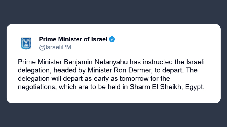 Il ministero degli Esteri di Israele ha riportato ieri su X che Netanyahu ha dato disposizione alla delegazione israeliana – guidata dal ministro Ron Dermer – di partire [per i negoziati su un cessate il fuoco a Gaza e il rilascio di ostaggi detenuti da Hamas ndr]. La delegazione partirà già domani per i negoziati, che si terranno a Sharm El Sheikh, in Egitto.