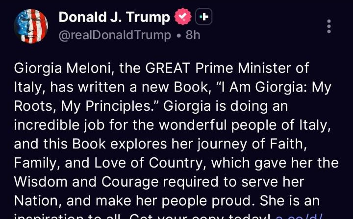 Donald Trump: il libro di Giorgia Meloni è un’ispirazione per tutti