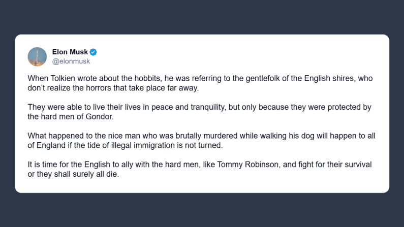 «Quando Tolkien scrisse degli hobbit, si riferiva ai gentiluomini delle contee inglesi, ignari degli orrori lontani. Potevano vivere in pace e serenità solo perché protetti dagli uomini duri di Gondor. Ciò che è accaduto al galantuomo brutalmente assassinato mentre portava a spasso il cane capiterà a tutta l’Inghilterra se non si inverte la marea dell’immigrazione illegale. È ora che gli inglesi si alleino con gli uomini duri, come Tommy Robinson, e lottino per la sopravvivenza, altrimenti periranno tutti».