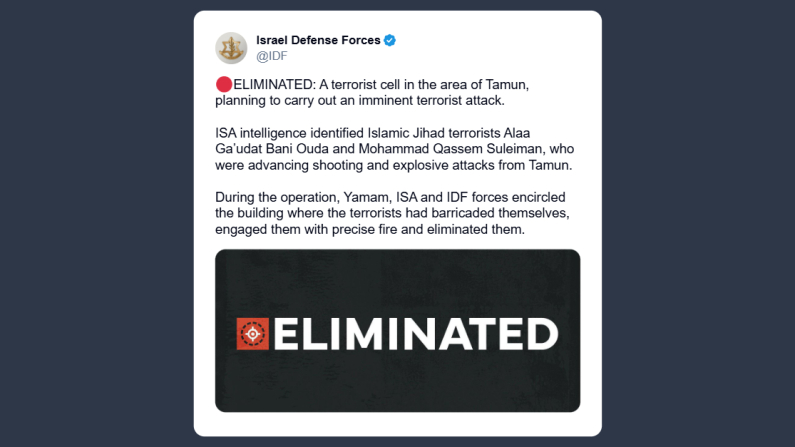 Le Forze di Difesa israeliane hanno annunciato su X l’eliminazione di una «cellula terroristica» della Jihad islamica a Tamun, intenta a compiere un «attacco imminente». l’intelligence israeliana, spiegano le Forze di Difesa, ha individuato due terroristi, Alaa Ga’udat Bani Ouda e Mohammad Qassem Suleiman, intenti a «pianificare attacchi armati mediante l’uso di esplosivi». Nel corso dell’operazione, le forze congiunte di Yamam (un’unità speciale della polizia di frontiera israeliana), l’intelligence e l’esercito israeliano hanno circondato l’edificio in cui i terroristi si erano barricati, riuscendo alla fine a neutralizzarli.