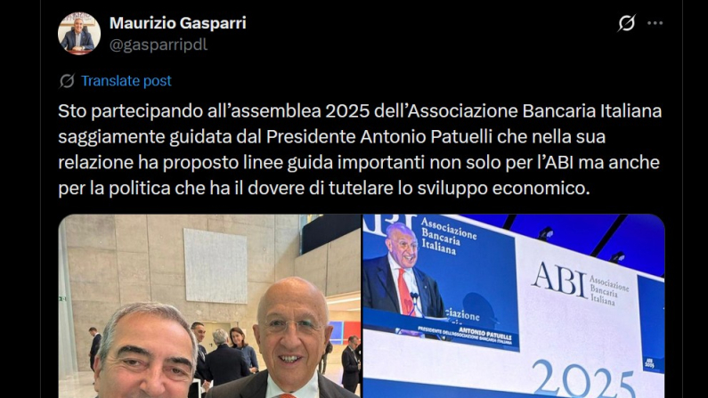 Il presidente dei senatori di Forza Italia, Maurizio Gasparri, ha scritto su X di stare «partecipando all’assemblea 2025 dell’Associazione Bancaria Italiana saggiamente guidata dal Presidente Antonio Patuelli», esprimendo apprezzamento per il presidente dell’Abi e sottolineando l’importanza delle proposte presentate: «Nella sua relazione ha proposto linee guida importanti non solo per l’Associazione bancaria Italiana ma anche per la politica che ha il dovere di tutelare lo sviluppo economico».