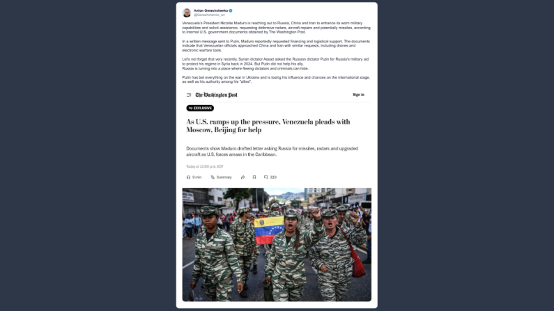 Anton Gerashchenkoex vice ministro degli Interni ucraino e consigliere ufficiale, ha commentato un post su X del Washington Post con la seguente dichiarazione: «il presidente venezuelano Nicolás Maduro si sta rivolgendo a Russia, Cina e Iran per potenziare le capacità militari logore e chiedere assistenza, richiedendo radar difensivi, riparazioni di aerei e potenzialmente missili, secondo documenti interni del Governo statunitense. In un messaggio scritto e inviato a Putin, Maduro avrebbe chiesto finanziamenti e supporto logistico. I documenti indicano che funzionari venezuelani si sono rivolti a Cina e Iran con richieste analoghe, inclusi droni e strumenti di guerra elettronica. Non dimentichiamo che di recente, nel 2024, il dittatore siriano Assad aveva chiesto al dittatore russo Putin l’aiuto militare della Russia per proteggere il suo regime in Siria. Ma Putin non ha soccorso il suo alleato. La Russia si sta trasformando in un rifugio per dittatori e criminali in fuga. Putin ha puntato tutto sulla guerra in Ucraina e sta perdendo influenza e credito sulla scena internazionale, oltre che autorità tra i suoi “alleati”».
