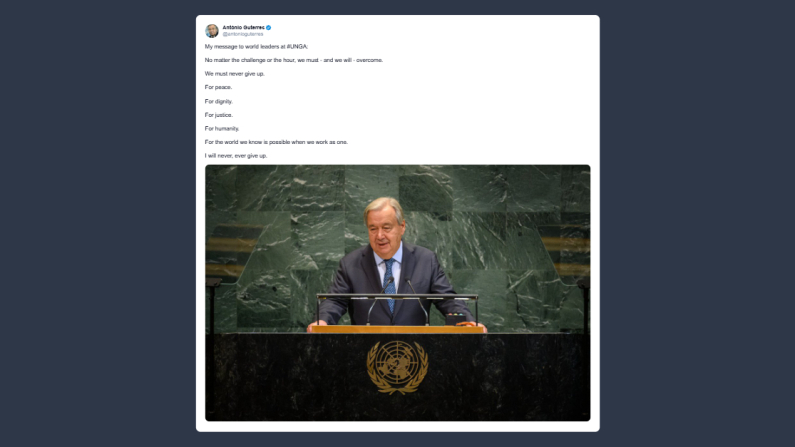 Il Segretario Generale delle Nazioni Unite, António Guterres, ha pubblicato su X un messaggio rivolto ai presidenti mondiali all’Assemblea Generale dell’Onu: «non importa quale sia la sfida, dobbiamo superare ogni ostacolo, e ce la faremo. Non dobbiamo mai arrenderci. Per la pace, per la giustizia e per l’umanità», ha dichiarato Gueterres, che ha poi concluso: «per un mondo che sappiamo essere possibile quando lavoriamo insieme. Io non mi arrenderò mai».