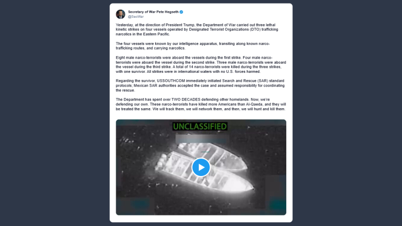 Il ministro della Guerra statunitense, Pete Hegseth, ha scritto su X: «ieri, su direttiva del presidente Trump, il ministero della Guerra ha condotto tre attacchi letali contro quattro imbarcazioni gestite da organizzazioni terroristiche che trafficano stupefacenti nell’Oceano Pacifico orientale. Le quattro imbarcazioni erano note ai nostri servizi di intelligence, navigavano lungo rotte consolidate del narcotraffico e trasportavano droga. Nel primo attacco a bordo c’erano otto uomini narcoterroristi, nel secondo quattro, nel terzo tre. In totale i tre raid hanno eliminato 14 narcoterroristi, con un solo superstite. Tutti gli attacchi sono avvenuti in acque internazionali, senza perdite tra le forze Usa. Quanto al superstite, il comando sud ha immediatamente attivato i protocolli standard di ricerca e soccorso; le autorità messicane hanno preso in carico il caso e coordinano le operazioni. Il ministero difende da oltre vent’anni le patrie altrui. Ora difende la propria. Questi narcoterroristi hanno ucciso più americani di Al-Qaeda e saranno trattati allo stesso modo. Li individueremo e li elimineremo».