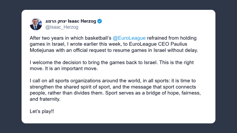 Il presidente israeliano, Isaac Herzog, ha scritto su X: «Dopo due anni in cui la pallacanestro della EuroLeague ha evitato di disputare partite in Israele, all’inizio di questa settimana ho scritto all’Af della EuroLeague Paulius Motiejunas con una richiesta ufficiale di riprendere le partite in Israele senza ulteriori ritardi. Accolgo con favore la decisione di riportare le partite in Israele».