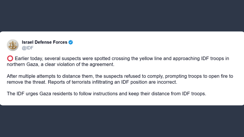 Le Forze di Difesa israeliane hanno scritto su X che questa mattina sono stati avvistati diversi «sospetti attraversare la linea gialla e avvicinarsi alle truppe delle Idf nel nord di Gaza, in chiara violazione dell’accordo. Dopo numerosi solleciti, i sospetti si sono rifiutati di obbedire, spingendo le truppe ad aprire il fuoco per neutralizzare la minaccia. Le notizie di terroristi che avrebbero infiltrato una posizione delle Idf sono inesatte». Le Idf, in conclusione, hanno esortano «i residenti di Gaza a seguire le istruzioni e a mantenere la distanza dall’esercito israeliano».