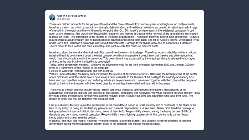 Il ministro degli Esteri israeliano Gideon Sa’ar, commentando lo storico evento della firma del trattato di pace Israele-Hamas a Sharm el Sheik l’8 ottobre 2025, ha scritto su X: