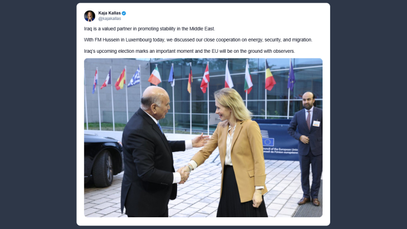 Il vicepresidente della Commissione europea, Kaja Kallas, ha dichiarato su X: «l’Iraq è un partner prezioso per promuovere la stabilità in Medio Oriente». «Oggi a Lussemburgo, con il ministro degli Esteri Hussein, abbiamo discusso della nostra stretta collaborazione in materia di energia, sicurezza e migrazione. Le imminenti elezioni in Iraq – ha concluso la Kallas – rappresentano un momento cruciale, e l’Ue sarà presente sul campo con osservatori».