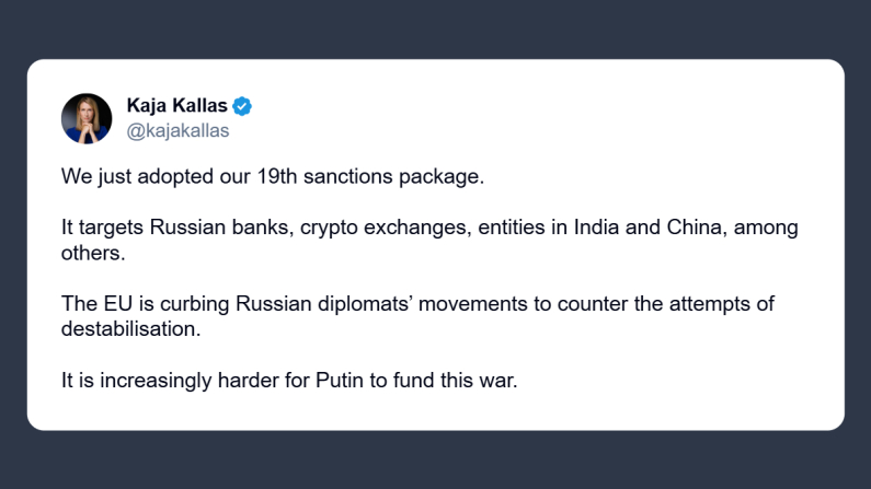 «Abbiamo adottato il diciannovesimo pacchetto di sanzioni. Il provvedimento colpisce banche russe, piattaforme di scambio di criptovalute e altri soggetti in India e Cina, tra gli altri. L’Unione Europea sta limitando gli spostamenti dei diplomatici russi per contrastare i tentativi di destabilizzazione. Per Vladimir Putin diventa sempre più difficile finanziare questa guerra».